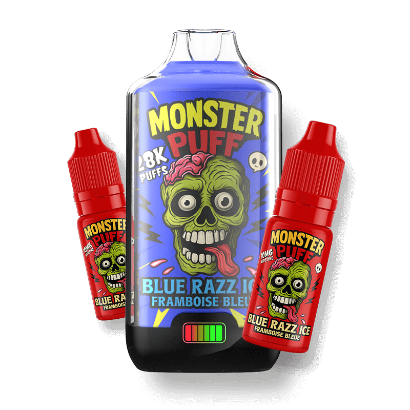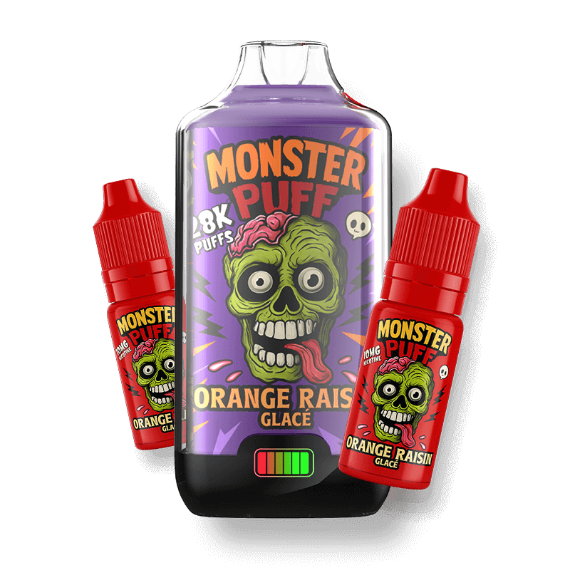 - Contenu du KitLe kit comprend 1 e-cigarette Monster Puff remplie, ainsi que 2 bouteilles de e-liquide de la même saveur et même taux de nicotine.